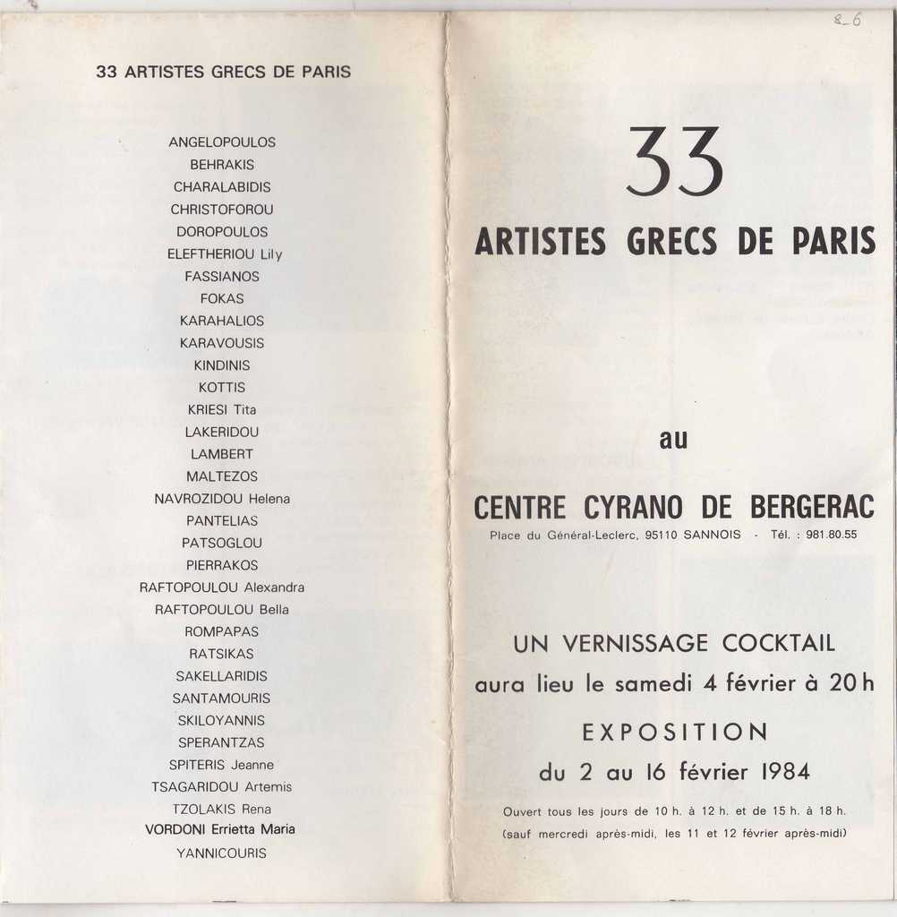 Έντυοπο έκθεσης, στα γαλλικά, χαρτί ιλουστρασιόν, 2 όψεις 21×11 εκ. Αναφορά στην έκθεση “33 artistes grecs de Paris” που γίνεται τον Φεβρουάριο του 1984. Περιέχει σύντομα βιογραφικά σημειώματα των καλλιτεχνών.