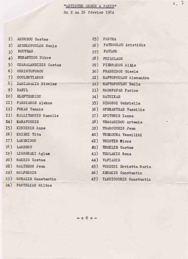Κατάλογος, δακτυλόγραφος, στα αγγλικά, χαρτί, μία όψη, 26,5×19 εκ., επικολλημένο σε φύλλο χαρτί Α4. Αναφέρονται οι καλλιτέχνες που συμμετείχαν στην έκθεση “Artistes grecs à Paris”.