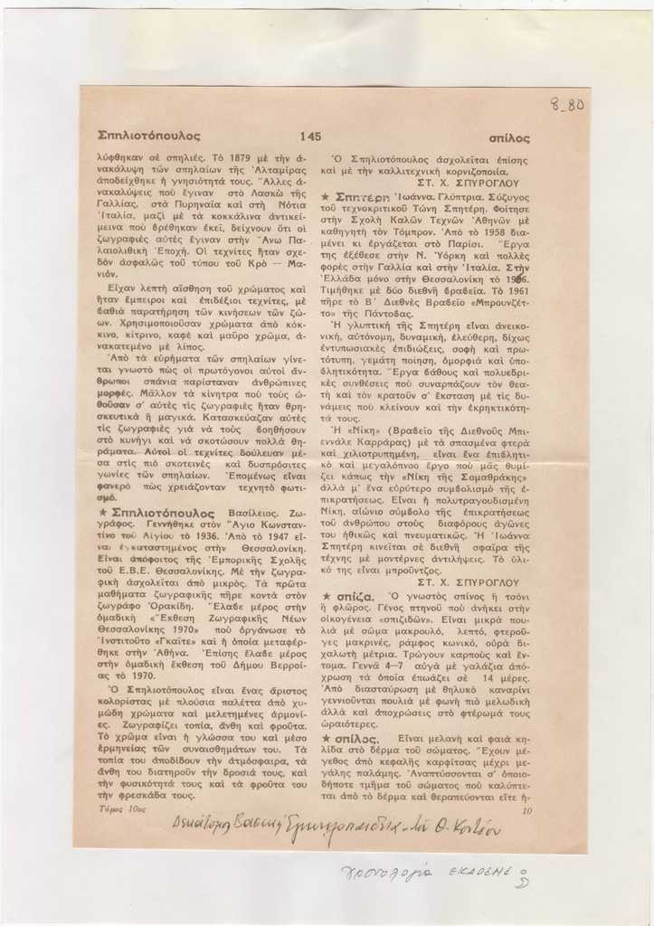 Απόκομμα εντύπου, στα ελληνικά, χαρτί, 25×16 εκ., επικολλημένο σε φύλλο χαρτί Α4. Απόσπασμα από την Δεκάτομη Βασική Εγκυκλοπαίδεια του Θ. Κοντέου που περιλαμβάνει λήμμα για την Ι.Βεροπούλου-Σπητέρη.