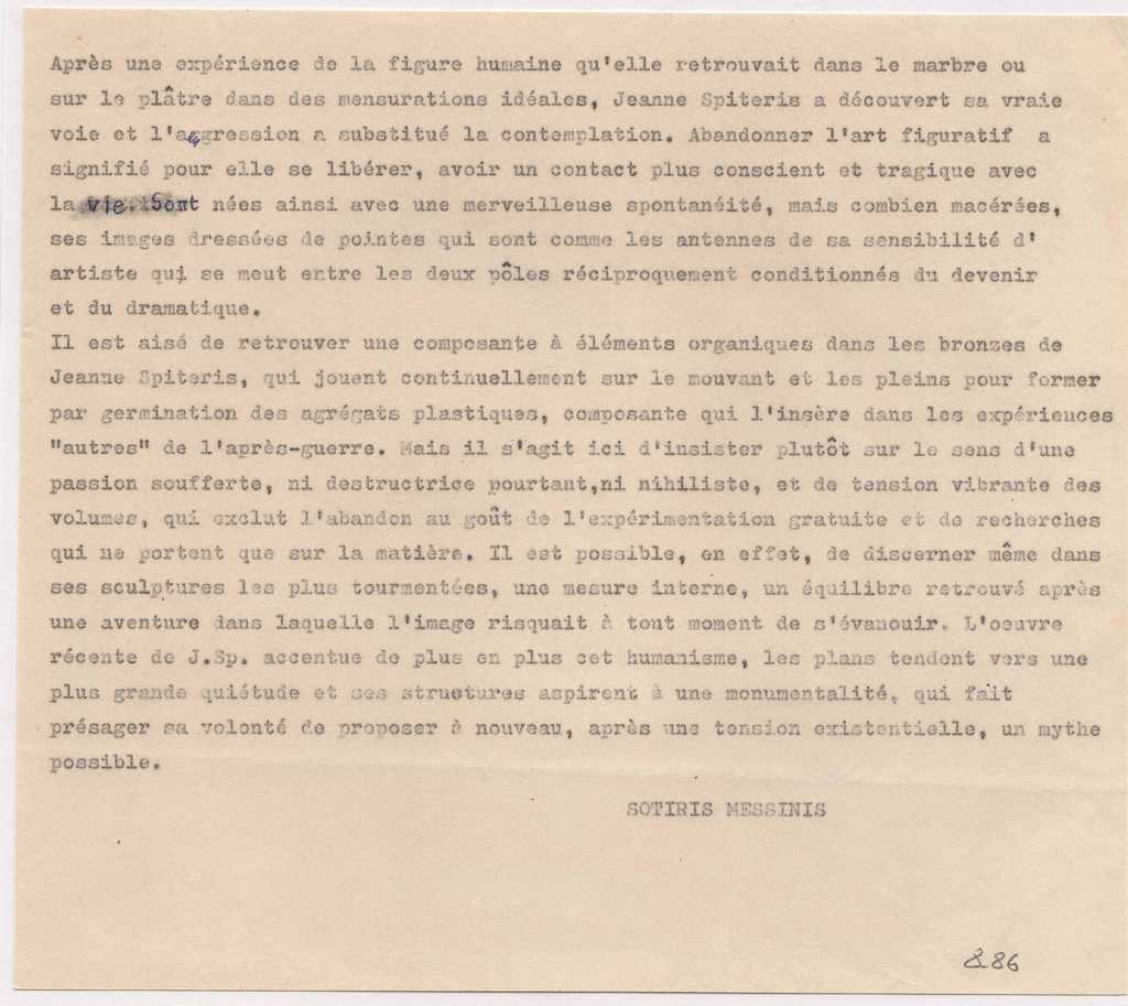 Κείμενο, δακτυλόγραφο, στα ελληνικά, χαρτί, μία όψη, 18×20,5 εκ. Αναφορά στη ζωή της Ι.Βεροπούλου-Σπητέρη και στην καλλιτεχνική της δημιουργία.
