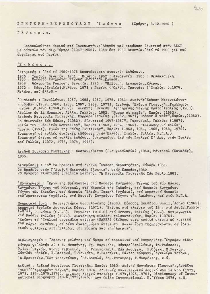 Κείμενο, δακτυλόγραφο, στα ελληνικά, χαρτί, ένα φύλλο, μία όψη, 29,5×21 εκ. Βιογραφικό σημείωμα της Ιωάννας Βεροπούλου-Σπητέρη από την αρχή της σταδιοδρομίας της έως το 1976. Περιλαμβάνει εκθέσεις, συμπόσια, διακρίσεις, εργογραφία, βιβλιογραφία, λεξικά.