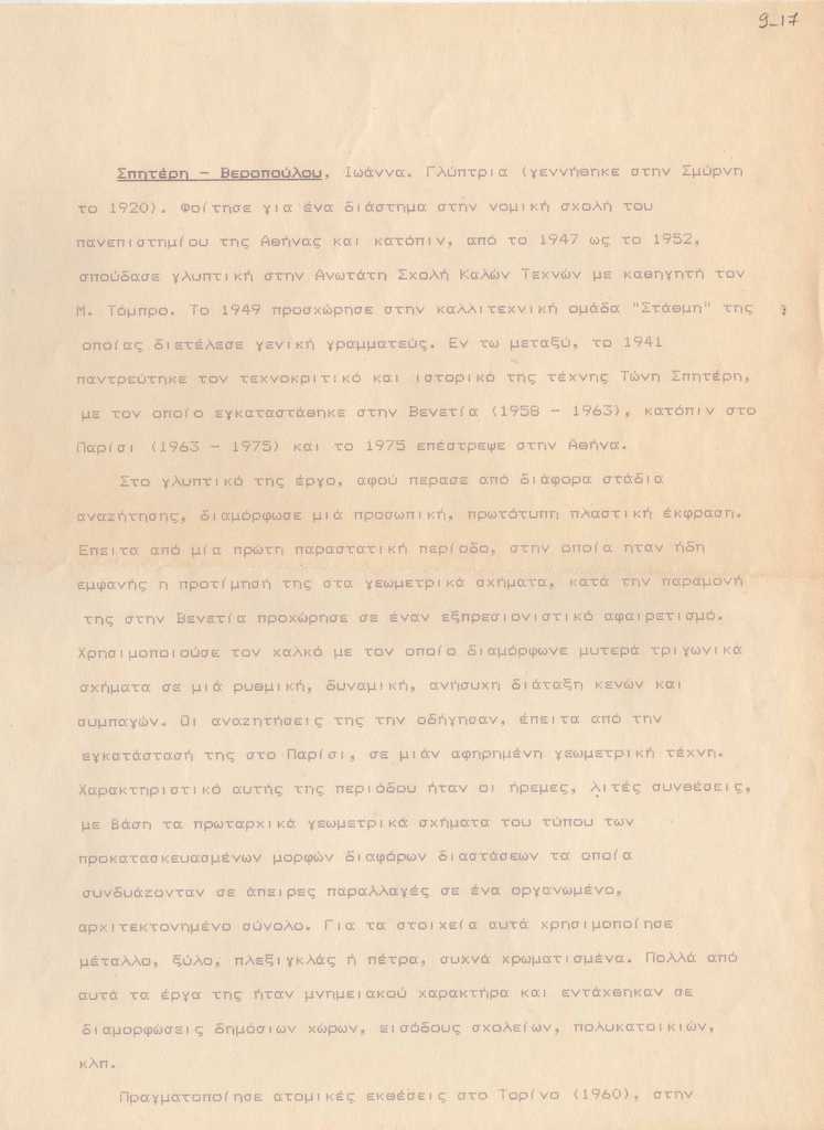 Κείμενο, δακτυλόγραφο, στα ελληνικά, χαρτί, δύο φύλλα, διπλής όψης, 28×20,5 εκ. Βιογραφικό σημείωμα της Ιωάννας Βεροπούλου-Σπητέρη από την αρχή της σταδιοδρομίας της έως το 1981. Περιλαμβάνει ανάλυση του έργου της, εκθέσεις, διακρίσεις, εργογραφία.