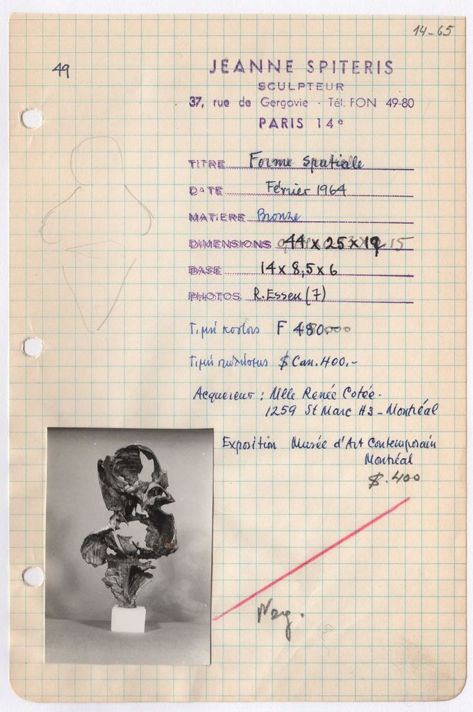 Απόκομμα, χαρτί, μία όψη, 21×14 εκ., επικολλημένο σε φύλλο χαρτιού Α4. Φόρμα καταγραφής στοιχείων έργου, όπου είναι επικολλημένη φωτογραφία του έργου, α/μ, φωτογραφικό χαρτί, 7×5 εκ. και σφραγίδα, στα γαλλικά, όπου συμπληρώνονται χειρόγραφα τα στοιχεία του έργου.