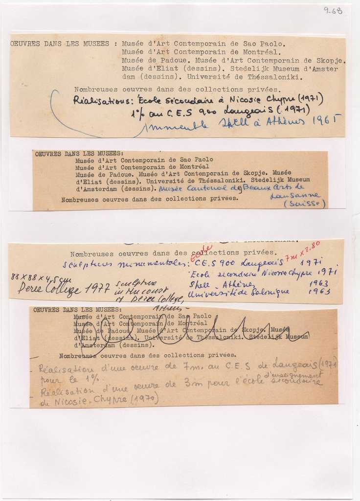 Αποκόμματα δακτυλόγραφων κειμένων, στα γαλλικά, χαρτί, τέσσερα τμήματα, 6×20 εκ., επικολλημένα σε φύλλο Α4. Τμήματα από βιογραφικά της Ιωάννας Βεροπούλου-Σπητέρη με αναφορές σε έργα της Ιωάννας Βεροπούλου-Σπητέρη, μέρη όπου αυτά φυλάσσονται, με χειρόγραφες σημειώσεις.