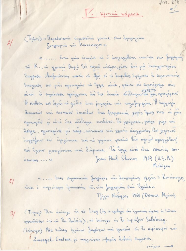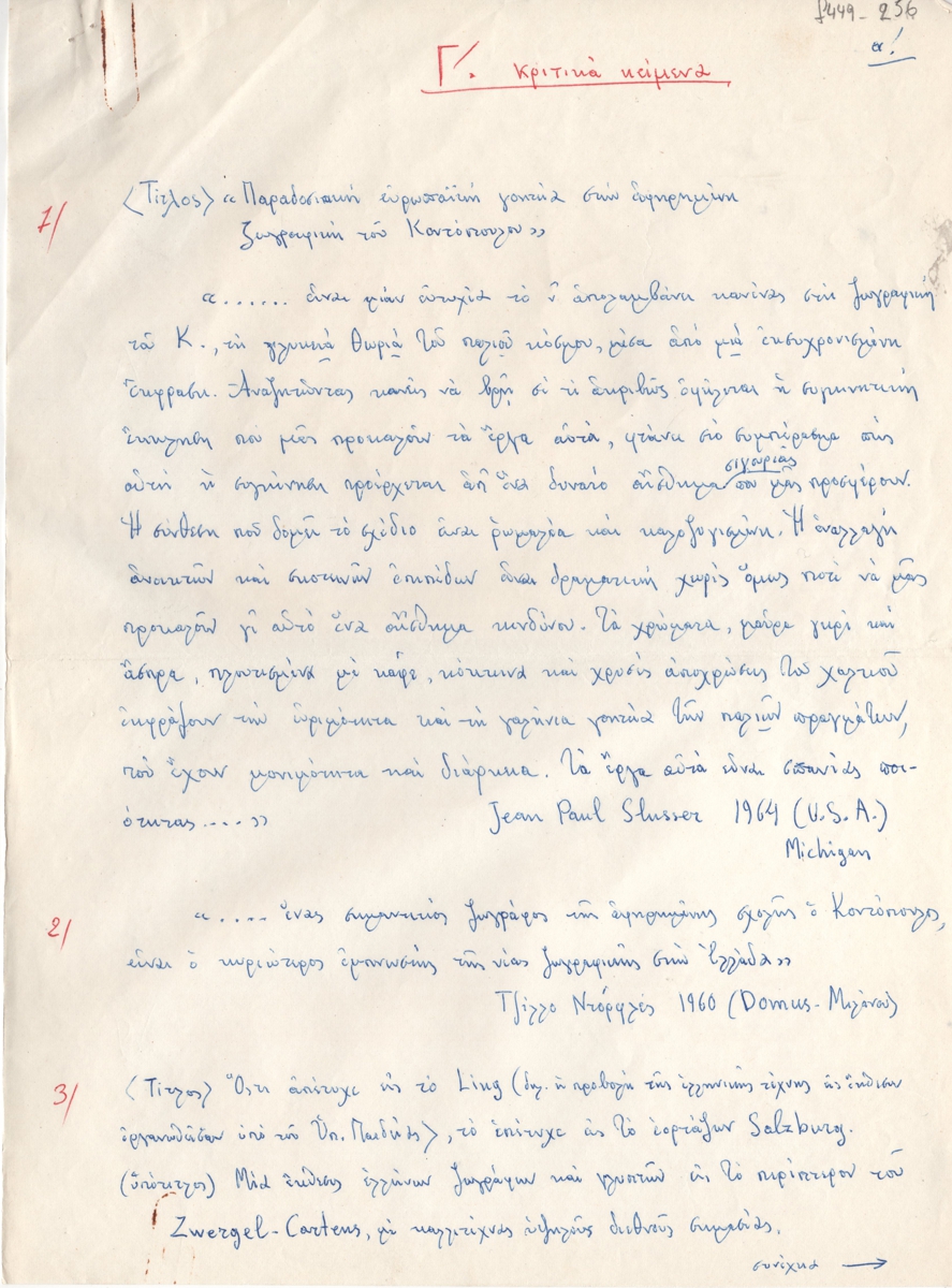 Κείμενο, χειρόγραφο, με μπλε μελάνι, στα ελληνικά, χαρτί, 2 φφ, 28,8×21,3 εκ. Αποδελτίωση κριτικών για τον Αλέκο Κοντόπουλο από τον διεθνή τύπο. Αποδελτιώνονται οι εξής πηγές: “Le Monde (05/1963), “Les Lettres Françaises” (1959), “Oberösterreiche Nachrichten (1963), “Domus” (1960).