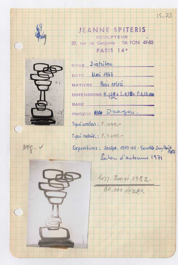 Απόκομμα, χαρτί, μία όψη, 21×14 εκ., επικολλημένο σε φύλλο χαρτιού Α4. Φόρμα καταγραφής στοιχείων έργου, όπου είναι επικολλημένες φωτογραφίες του έργου, έγχρωμες, φωτογραφικό χαρτί, 5,5×3 εκ. και 7,5×5 εκ. και σφραγίδα, στα γαλλικά, όπου συμπληρώνονται χειρόγραφα τα στοιχεία του έργου, στα γαλλικά και ελληνικά.