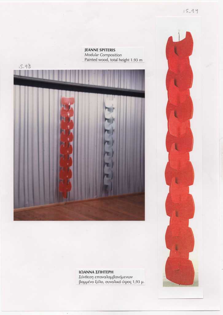 Απόκομμα εντύπου, 27×4,5 εκ. Άνω και κάτω της φωτογραφίας επικολλημένα αποκόμματα εντύπου με λεζάντες, στα γαλλικά και αγγλικά και στα ελληνικά, αντίστοιχα: JEANNE SPITERIS, Modular Composition, Painted wood, total height 1.93 m και ΙΩΑΝΝΑ ΣΠΗΤΕΡΗ, Σύνθεση επαναλαμβανόμενων, βαμμένο ξύλο, συνολικό ύψος 1,93 μ. Επικολλημένη σε φύλλο Α4, μαζί με απόκομμα εντύπου που απεικονίζει αναπαραγωγή του ίδιου έργου.