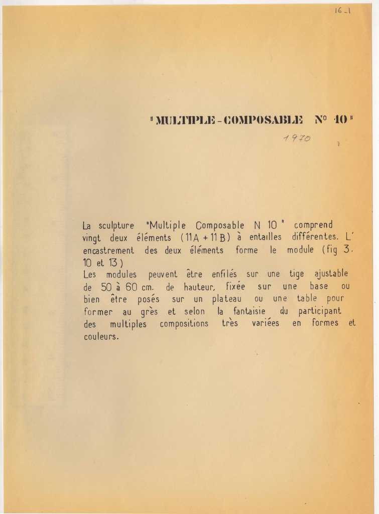 Έντυπο, στα γαλλικά, 16 φύλλα, χαρτί, μίας όψης, 29×13,5 εκ. Αποκόμματα ή προσχέδιο της ατομικής έκθεσης με τίτλο “Sculpture Jeanne Spiteris – Multiple Composable No. 10”. Περιλαμβάνει κείμενο και σχέδια των έργων. Στην πρώτη σελίδα, επιγραφή.