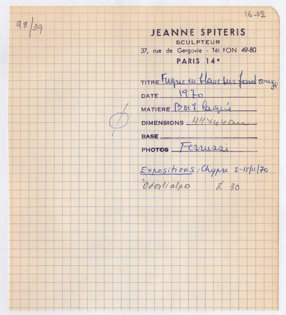 Απόκομμα, χαρτί, μία όψη, 18×16 εκ., επικολλημένο σε φύλλο χαρτιού Α4. Φόρμα καταγραφής στοιχείων έργου, και σφραγίδα, στα γαλλικά, όπου συμπληρώνονται χειρόγραφα τα στοιχεία του έργου.