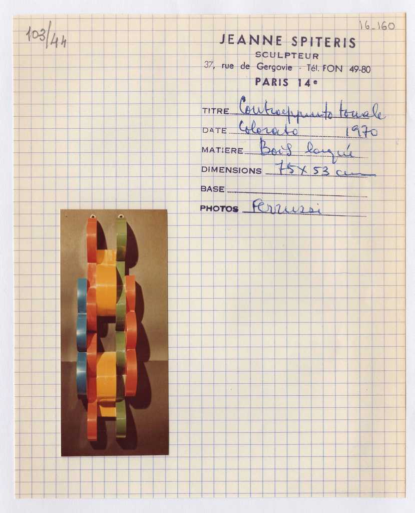 Απόκομμα, χαρτί, μία όψη, 20×16 εκ., επικολλημένο σε φύλλο χαρτιού Α4. Φόρμα καταγραφής στοιχείων έργου, όπου είναι επικολλημένη μία φωτογραφία του έργου, έγχρωμη, φωτογραφικό χαρτί, 10×4,5 εκ. Σφραγίδα, στα γαλλικά, όπου συμπληρώνονται χειρόγραφα τα στοιχεία του έργου.