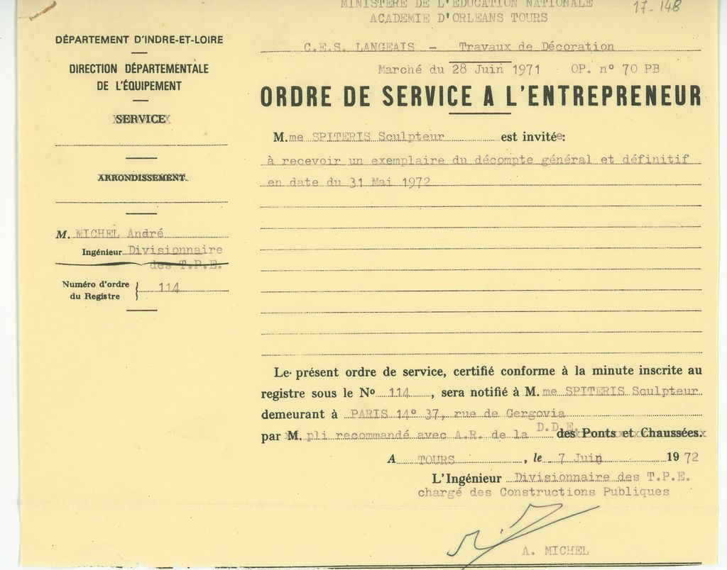 Κείμενο, δακτυλόγραφο, στα γαλλικά, χαρτί μίας όψης, φόρμα καταγραφής στοιχείων, 29×21 εκ. Στο κείμενο γίνεται αναφορά στην διαδικασία υλοποίησης του έργου της Ι. Βεροπούλου-Σπητέρη, “Elan Vital”, σε σχολείο στο Langeais της Γαλλίας.
