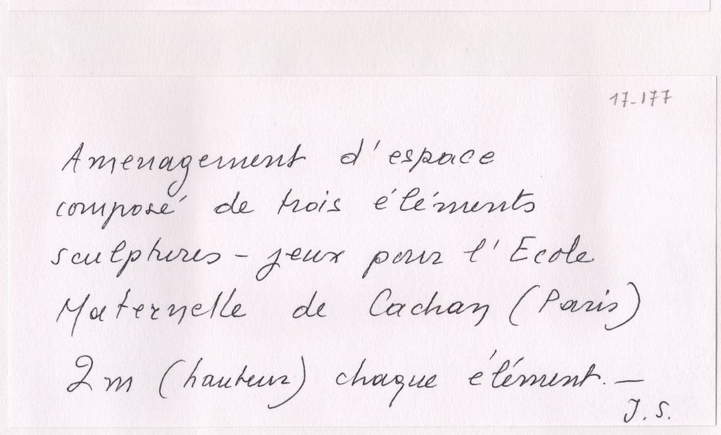 Κείμενο, χειρόγραφο, με μαύρο μελάνι, στα γαλλικά, 8,5×16,5 εκ., επικολλημένο σε φύλλο χαρτί Α4, μαζί με άλλο κείμενο. Αναφέρνονται τα στοιχεία του έργου.