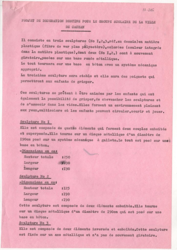 Έγγραφο, δακτυλόγραφο, σε φύλλο χαρτί, δύο σελίδες, 27×19 εκ. η κάθεμια. Στο έγγραφο γίνεται αναφορά στα στοιχεία του έργου της Ι. Σπητέρη που τοποθετήθηκε στην αυλή του σχολείου Ecole Maternelle στο Cachan της Γαλλίας.