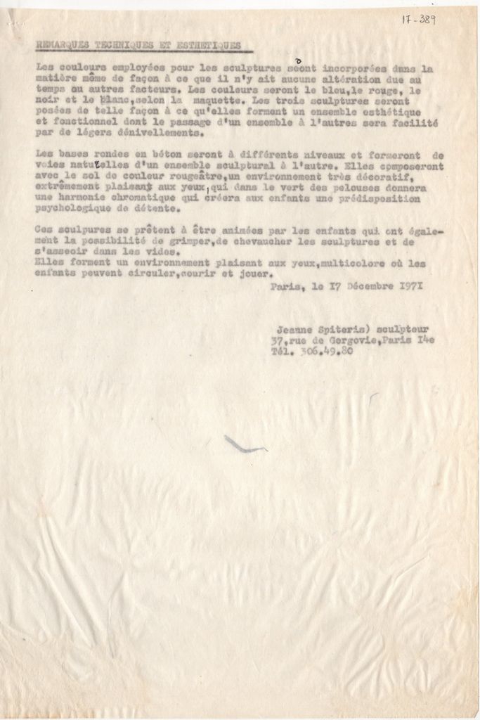 Έγγραφο, δακτυλόγραφο, σε φύλλο χαρτί, τρεις σελίδες, 28×19 εκ. η κάθεμια. Στο έγγραφο γίνεται αναφορά στην υλοποίηση του έργου της Ι. Σπητέρη που τοποθετήθηκε στην αυλή του σχολείου Ecole Maternelle στο Cachan της Γαλλίας.