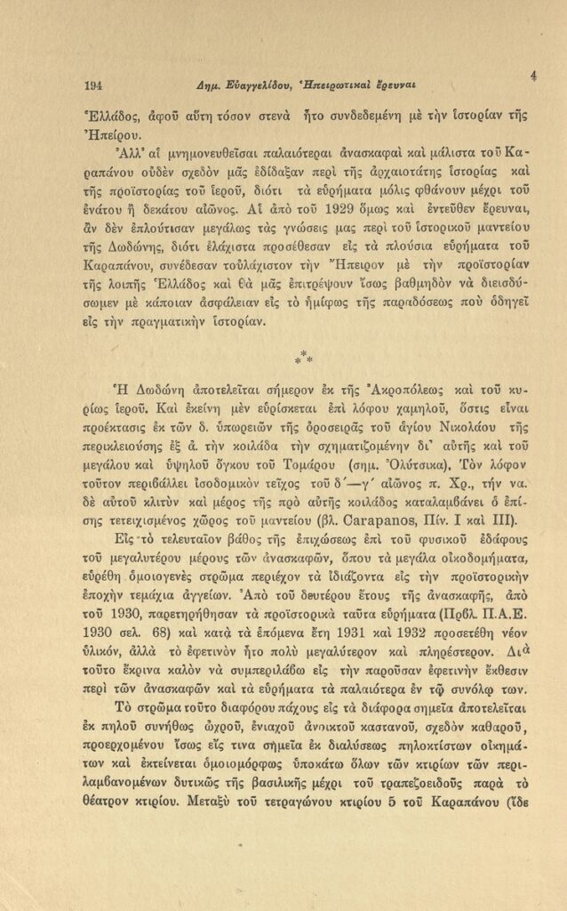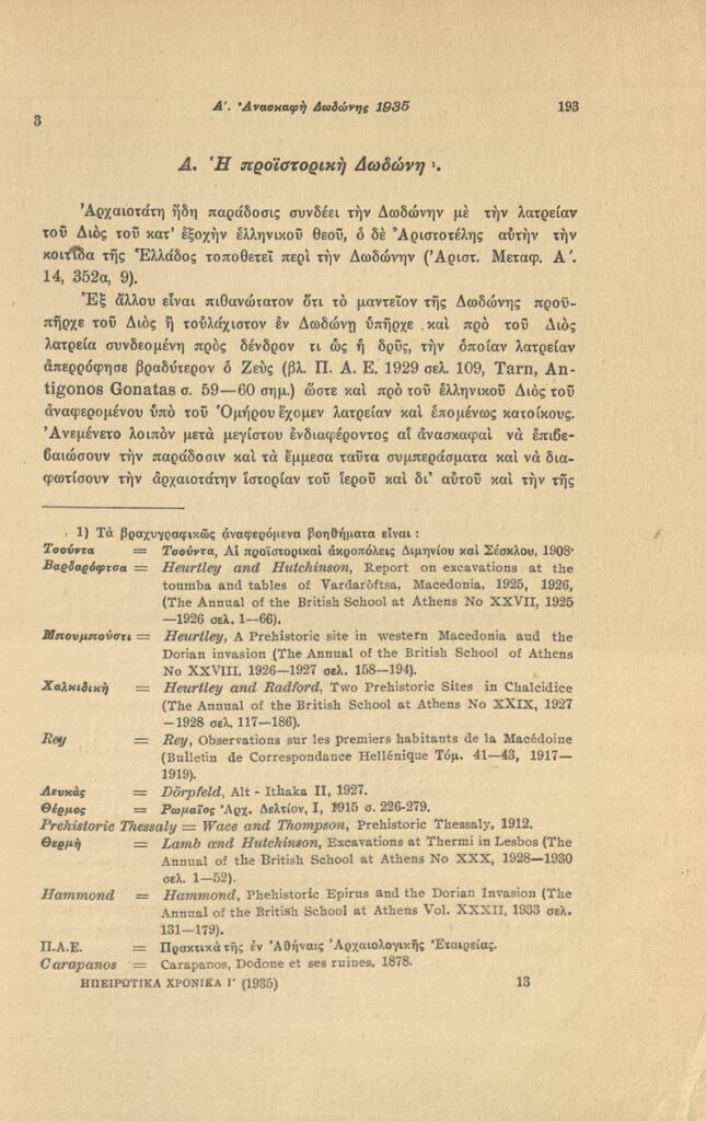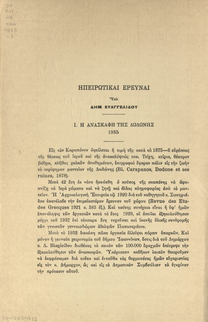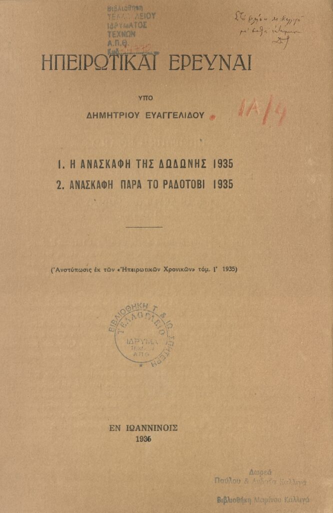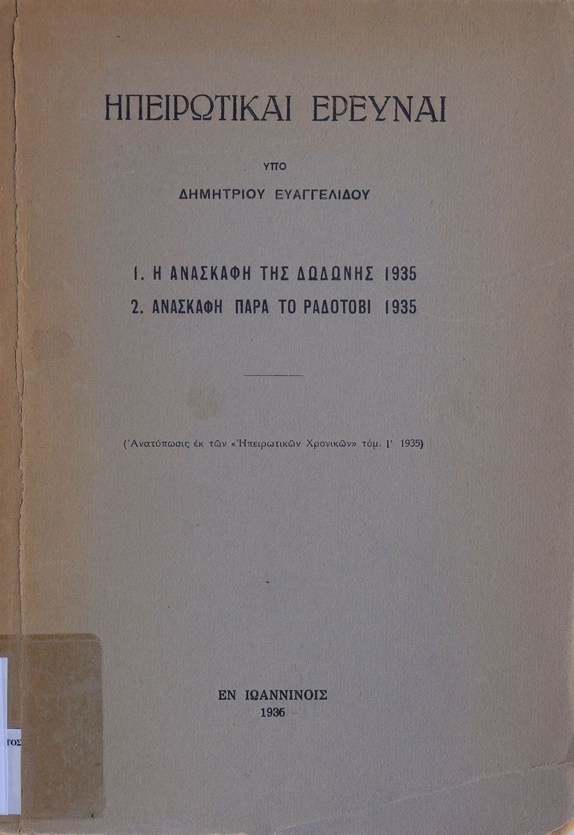 Ηπειρωτικαί έρευναι Ι. Η ανασκαφή της Δωδώνης 1935 ΙΙ. Ανασκαφή παρά το Ραδοτόβι 1935