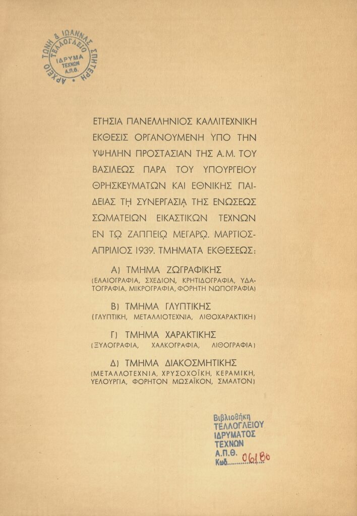 Ετήσια Πανελλήνιος Καλλιτεχνική Έκθεσις, Ζάππειον Μέγαρον, Αθήνα, 01/03/1939 - 30/04/1939