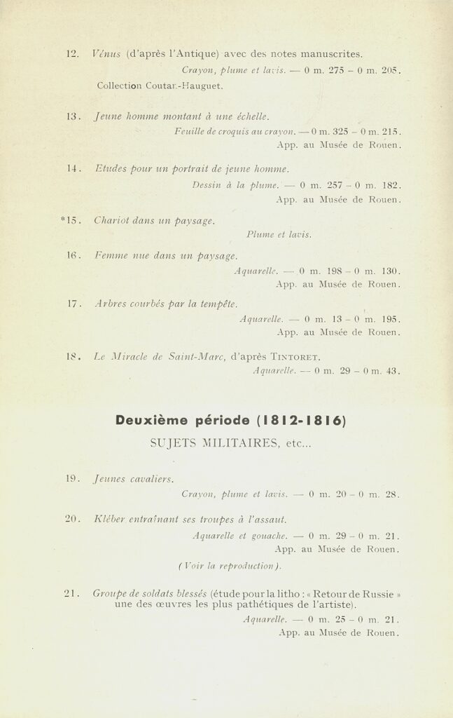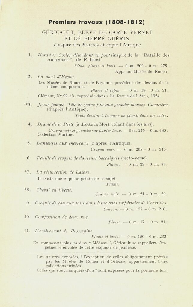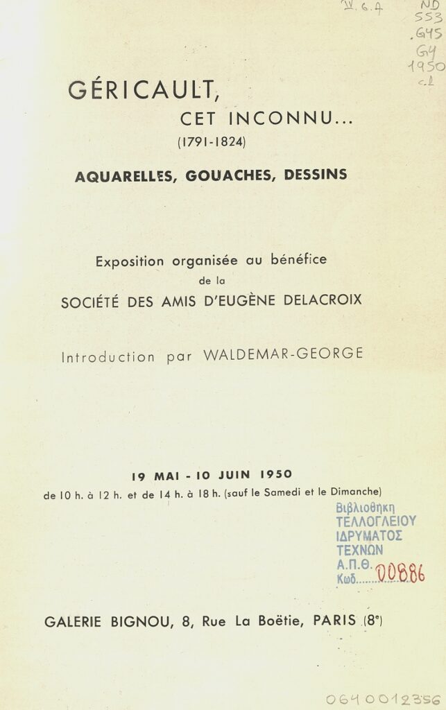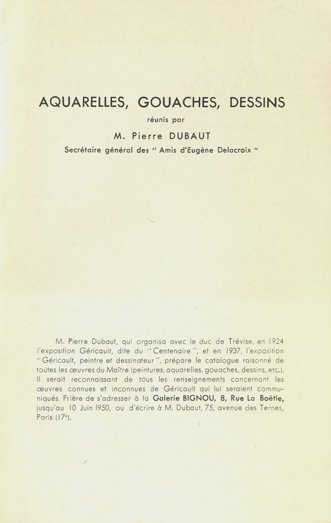 Géricault, cet inconnu … (1791-1824) : aquarelles, gouaches, dessins. Exposition organisée au bénéfice de la Société des amis d’Eugène Delacroix : 19.5.-10.6.1950 : Galerie Bignou, Paris