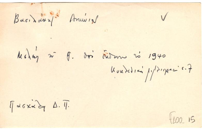 Βιβλιογραφικό δελτίο, χειρόγραφο με μπλε μελάνι, χαρτί, 7,6×12,4 εκ., στα ελληνικά, με δυσανάγνωστη παραπομπή σε έντυπο για τον Αντώνη Βασιλάκη.