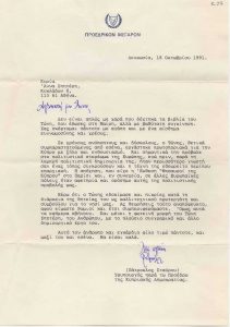 Δακτυλόγραφη επιστολή, χαρτί, στα ελληνικά, απεσταλμένη από την Ντόρα Μπακογιάννη, προς την Ιωάννα Βεροπούλου-Σπητέρη, αναφορικά με λήξη θητείας της καλλιτέχνιδας στην Επιτροπή Συνταξιοδότησης Καλλιτεχνών και Μουσουργών.