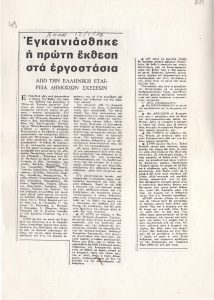 Εγκαινιάσθηκε η πρώτη έκθεση στα εργοστάσια από την Ελληνική Εταιρεία Δημοσίων Σχέσεων Γιώργος Ιωάννου (1926 - 2017) ; Γιώργος Ιωάννου (1926 - 2017) ; Ελένη Βακαλό (1921 - 2001) ; Γιώργος Τούγιας (1922 - 1994) ; Δημήτρης Περδικίδης (1922 - 1989) ; Γιάννης Μιγάδης (1926 - 2017) ; Μίνως Αργυράκης (1920 - 1998) ; Γ. Νικολακόπουλος ; Γιάννης Γαΐτης (1923 - 1984) ; Δημήτρης Μυταράς (1934 - 2017) ; Παντελής Ξαγοράρης (1929 - 2000) ; Άρια Κομιανού (1938 - 2015) ; Μάριος Βατζιάς (1926 - 2008) ; Γιώργος Βογιατζής (1935 - 1993) ; Γιάννης Παρμακέλης (1932) ; Δανιήλ Γουναρίδης (1934) ; Νίκη Καναγκίνη (1933 - 2008) ; Νανά Ησαΐα ; Βαλέριος Καλούτσης (1927 - 2014) ; Λευτέρης Κανακάκις (1934 - 1985) ; Ράλλης Κοψίδης (1929 - 2010) ; Στάθης Λογοθέτης (1925 - 1997) ; Ζανίν Μπαέτ ; Νόρα Αρχελάου (1937) ; Μπία Ντάβου (1932 - 1996) ; Γρηγόρης Σεμιτέκολο ; Βασίλης Σκυλάκος (1930 - 2000) ; Θανάσης Στεφόπουλος (1928 - 2012) ; Philip Tarlow (1940) ; Χρυσούλα Ρωξάνη ; Θεοτόκης Ζερβός ; Σ. Σβορώνος ; Μάριος Τσαρούχης ; Α. Πινότσης ; Ζωή Ουντινόττι ; Κελλίδης
