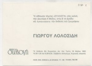 Ομαδική έκθεση «Ελληνικός Μήνας στη Βιέννη». Πάνος Βαλσαμάκης (1900 - 1986) ; Δημήτρης Γιαννουκάκης (1898 - 1991) ; Θόδωρος Μάρκελλος (1925 - 2015) ; Γιάννης Γαΐτης (1923 - 1984) ; Κούλα Μπεκιάρη (1905 - 1992) ; Δημήτρης Μυταράς (1934 - 2017) ; Πιπίτσα Φιλιππίδη (1923 - 1995) ; Χαρίκλεια Φωτίου-Χατζησάββα (1918 - 1984) ; Κωνσταντίνος Γιαννακόπουλος (1927 - 2000) ; Αντώνης Απέργης (1938 - 2018) ; Τάκης Παρλαβάντζας ; Πέτρος Ζουμπουλάκης (1937) ; Θάλεια Κλεώπα (1928) ; Γεώργιος Λολοσίδης (1937 - 2015) ; Μποστ (Μέντης Μποσταντζόγλου) (1918 - 1995) ; Μαρία Σπέντζα (1925 - 2011) ; Μανόλης Πηλαδάκης (1927) ; Μερόπη Πρέκα-Στεφανάτου (1934 - 2025) ; Πάρις Πρέκας (1926 - 1999) ; Λιλή Αντωνιάδη-Στεφανάκη (1938) ; Ιωάννης Σεργουλόπουλος ; Βασίλειος Σπηλιωτόπουλος ; Σταμάτης-Παναγιώτης Μεταξάς (1936) ; Στέφανος Δασκαλάκης (1952) ; Ιωάννης Παπανελόπουλος (1936) ; Άγγελος Κουγιουμτζής (1920 - 2011) ; Σπύρος Κουρσάρης ; Κωνσταντίνος Παπασταμούλης ; Γιάννης Πούλιος