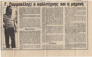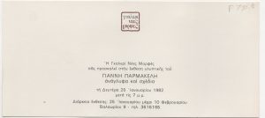 Εγκαινιάσθηκε η πρώτη έκθεση στα εργοστάσια από την Ελληνική Εταιρεία Δημοσίων Σχέσεων Γιώργος Ιωάννου (1926 - 2017) ; Γιώργος Ιωάννου (1926 - 2017) ; Ελένη Βακαλό (1921 - 2001) ; Γιώργος Τούγιας (1922 - 1994) ; Δημήτρης Περδικίδης (1922 - 1989) ; Γιάννης Μιγάδης (1926 - 2017) ; Μίνως Αργυράκης (1920 - 1998) ; Γ. Νικολακόπουλος ; Γιάννης Γαΐτης (1923 - 1984) ; Δημήτρης Μυταράς (1934 - 2017) ; Παντελής Ξαγοράρης (1929 - 2000) ; Άρια Κομιανού (1938 - 2015) ; Μάριος Βατζιάς (1926 - 2008) ; Γιώργος Βογιατζής (1935 - 1993) ; Γιάννης Παρμακέλης (1932) ; Δανιήλ Γουναρίδης (1934) ; Νίκη Καναγκίνη (1933 - 2008) ; Νανά Ησαΐα ; Βαλέριος Καλούτσης (1927 - 2014) ; Λευτέρης Κανακάκις (1934 - 1985) ; Ράλλης Κοψίδης (1929 - 2010) ; Στάθης Λογοθέτης (1925 - 1997) ; Ζανίν Μπαέτ ; Νόρα Αρχελάου (1937) ; Μπία Ντάβου (1932 - 1996) ; Γρηγόρης Σεμιτέκολο ; Βασίλης Σκυλάκος (1930 - 2000) ; Θανάσης Στεφόπουλος (1928 - 2012) ; Philip Tarlow (1940) ; Χρυσούλα Ρωξάνη ; Θεοτόκης Ζερβός ; Σ. Σβορώνος ; Μάριος Τσαρούχης ; Α. Πινότσης ; Ζωή Ουντινόττι ; Κελλίδης