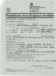 Λίστα καλλιτεχνών που συμμετέχουν στην Μπιεννάλε Γλυπτικής (‘Παναθήναια’) 1965 Pablo Picasso (1881 - 1973) ; Joan Miró (1893 - 1983) ; Τώνης Π. Σπητέρης (1910 - 1986) ; Pierre-Auguste Renoir (1841 - 1919) ; Salvador Dalí (1904 - 1989) ; Alexander Calder (1898 - 1976) ; Auguste Rodin (1840 - 1917) ; Jean Arp (1886 - 1966) ; Max Ernst (1891 - 1976) ; Henri Matisse (1869 - 1954) ; Georges Braque (1882 - 1963) ; Fernand Léger (1881 - 1955) ; Jacques Lipchitz ; Morice Lipsi (1898 - 1986) ; Henri Laurens (1885 - 1954) ; Edgar Degas (1834 - 1917) ; Amedeo Modigliani (1884 - 1920) ; Aristide Maillol (1861 - 1944) ; Jean Fautrier (1898 - 1964) ; Isamu Noguchi (1904 - 1988) ; Germaine Richier (1904 - 1959) ; Alberto Giacometti (1901 - 1966) ; Ossip Zadkine (1890 - 1967) ; Jean Dubuffet (1901 - 1985) ; Raymond Duchamp-Villon (1876 - 1918) ; Honoré Daumier (1808 - 1879) ; Charles Despiau (1874 - 1946) ; Otto Freundlich (1878 - 1943) ; Julio Gonzalez (1876 - 1942) ; Pablo Gargallo (1881 - 1934) ; Charles Malfray ; Sesostris Vitullo ; Etienne Beöthy (1897 - 1961) ; Pablo Curatella Manes ; Manolo (1872 - 1945) ; Constantin Brancusi (1876 - 1957) ; Alexander Archipenko (1887 - 1964) ; Jean Peyrissac (1895 - 1974) ; François Pompon (1885 - 1933) ; Joseph Csaky (1888 - 1971) ; Anton Prinner (1902 - 1983) ; Jean Chauvin ; Honorio Garcia Condoy ; Peter Stackpole (1913 - 1997) ; Cleopatre Bourdelle-Sevastos (1892 - 1972)