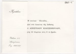 Έκθεση με τίτλο “Ομαδική έκθεση μινιατούρας ζωγραφικής-γλυπτικής” Πέννυ Δίκα Κορνέτη (1945) ; Μανόλης Γιανναδάκης (1954) ; Αλεξάνδρα Κατσιάνη (1954) ; Χονδρός Θανάσης (1953) ; Απόστολος Κιλεσσόπουλος (1942) ; Νίκος Κούτουλας (1943) ; Ρηνιώ Μουρέλου-Κυριαζίδη (1952) ; Τζοβανάκης ; Γεράσιμος Καραντινός ; Θανάσης Μπακογιώργος (1942) ; Φλοριάννα Ηλιοπούλου ; Καίτη Σταυρούδη (1933 - 2015) ; Χριστιάνα Ηλιοπούλου ; Θανάσης Μανούσης ; Βασίλης Ρογκότης (1915 - 1999) ; Ανδρέας Ζαμπέτογλου (1936 - 2006) ; Μάνια Ζιώγα ; Carita Schmidt ; Δημήτρης Βλαχογιάννης (1965) ; Βάλια Δαβράδου (1969) ; Κωνσταντίνος Καρανός ; Ντίνος Παπασπύρου (1938 - 2024) ; Τάρση Τζενανίδου ; Κωνσταντίνα Δελλατόλα-Μπάτζιου (1931 - 2015) ; Ελένη Θεοφύλακτου ; Ραφαήλ Ιωαννίδης ; Δημήτρης Λιολιόπουλος ; Νικόλας Σφήκας (1961) ; Κατερίνα Νικόλτσου-Ματεζόφσκυ ; Νικόλαος Πιλάτης (1944) ; Βασιλική Καραμπατάκη ; Νίκος Σταυρακαντωνάκης ; Hanne Voukalis ; Βασίλης Νατσιούλας ; Ελπίδα Τσιλιπάκου ; Ζαχαρίας Κουμπλής ; Τάκης Τσεντεμαΐδης (1944 - 2019) ; Νικόλας Κυριακού ; Κωνσταντίνος Τσέλιος (1941) ; Ρένα Τσιτώτα (1942) ; Χάρης Λαδόπουλος ; Νίκος Μαραγκός ; Βασίλειος Ιωαννίδης ; Μαρία Κομπατσιάρη ; Μαίρη Κυριαζοπούλου ; Σωτήρης Μουστάκας ; Σώτος Ζαχαριάδης ; Αθανάσιος Καραμήτας ; Νικόλας Μπλιάτκας (1962)