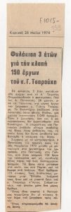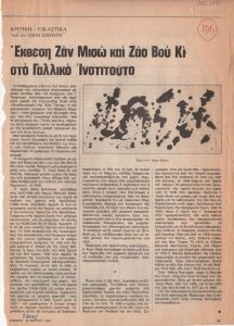 «Εκθέσεις ζωγραφικής. Μία ωραία πρωτοβουλία υπέρ των οικογενειών των Κυπρίων κρατουμένων» Τώνης Π. Σπητέρης (1910 - 1986) ; Βάσω Κατράκη (1914 - 1988) ; Σπύρος Βασιλείου (1902 - 1985) ; Ορέστης Κανέλλης (1910 - 1979) ; Τάσσος Α. (1914 - 1985) ; Νικόλαος Χατζηκυριάκος-Γκίκας (1906 - 1994) ; Γιάννης Μόραλης (1916 - 2009) ; Γεώργιος Γουναρόπουλος (1889 - 1977) ; Σπύρος Παπαλουκάς (1892 - 1957) ; Γιάννης Μηταράκης (1898 - 1963) ; Αγήνωρ Αστεριάδης (1898 - 1977) ; Γιώργος Σικελιώτης (1917 - 1984) ; Γιάννης Σπυρόπουλος (1912 - 1990) ; Γιάννης Τσαρούχης (1910 - 1989) ; Δημήτρης Γιαννουκάκης (1898 - 1991) ; Χρήστος Καπράλος (1909 - 1993) ; Λίλη Αρλιώτη (1908 - 1979) ; Φρόσω Ευθυμιάδη-Μενεγάκη ; Αλέκος Κοντόπουλος (1904 - 1975) ; Ευθύμιος Παπαδημητρίου (1895 - 1958) ; Γιώργος Μπουζιάνης (1885 - 1959) ; Γιάννης Κεφαλληνός (1894 - 1957) ; Περικλής Βυζάντιος (1893 - 1972) ; Δημήτρης Γιολδάσης (1897 - 1993) ; Κωνσταντίνος Γραμματόπουλος (1916 - 2003) ; Χρίστος Δαγκλής (1916 - 1991) ; Άγγελος Θεοδωρόπουλος (1883 - 1965) ; Γεώργιος Κοσμαδόπουλος (1895 - 1967) ; Κλέαρχος Λουκόπουλος (1906 - 1995) ; Αγλαϊα Παπά ; Φώτης Φωτιάδης