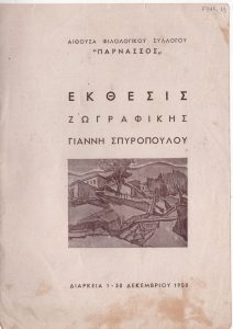 Έκθεση “Λαχειοφόρος έκθεσις της ερανικής επιτροπής δια την ενίσχυσιν των οικογενειών των κρατούμενων Κυπρίων” Τώνης Π. Σπητέρης (1910 - 1986) ; Βάσω Κατράκη (1914 - 1988) ; Σπύρος Βασιλείου (1902 - 1985) ; Ορέστης Κανέλλης (1910 - 1979) ; Τάσσος Α. (1914 - 1985) ; Νικόλαος Χατζηκυριάκος-Γκίκας (1906 - 1994) ; Γιάννης Μόραλης (1916 - 2009) ; Γεώργιος Γουναρόπουλος (1889 - 1977) ; Σπύρος Παπαλουκάς (1892 - 1957) ; Γιάννης Μηταράκης (1898 - 1963) ; Αγήνωρ Αστεριάδης (1898 - 1977) ; Γιώργος Σικελιώτης (1917 - 1984) ; Γιάννης Σπυρόπουλος (1912 - 1990) ; Γιάννης Τσαρούχης (1910 - 1989) ; Δημήτρης Γιαννουκάκης (1898 - 1991) ; Χρήστος Καπράλος (1909 - 1993) ; Λίλη Αρλιώτη (1908 - 1979) ; Φρόσω Ευθυμιάδη-Μενεγάκη ; Αλέκος Κοντόπουλος (1904 - 1975) ; Γιώργος Μπουζιάνης (1885 - 1959) ; Γιάννης Κεφαλληνός (1894 - 1957) ; Περικλής Βυζάντιος (1893 - 1972) ; Δημήτρης Γιολδάσης (1897 - 1993) ; Κωνσταντίνος Γραμματόπουλος (1916 - 2003) ; Χρίστος Δαγκλής (1916 - 1991) ; Άγγελος Θεοδωρόπουλος (1883 - 1965) ; Γεώργιος Κοσμαδόπουλος (1895 - 1967) ; Κλέαρχος Λουκόπουλος (1906 - 1995) ; Αγλαϊα Παπά (1904 - 1984)