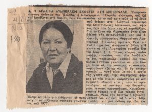 Artistes grecs à Paris Ιωάννα Σπητέρη-Βεροπούλου (1920 - 2000) ; Μάρκος Βαφειάδης (1906 - 1992) ; Μπέλλα Ραφτοπούλου (1902 - 1992) ; Παύλος (Διονυσόπουλος) (1930 - 2019) ; Τζον Χριστοφόρου (1921 - 2014) ; Αλέκος Φασιανός (1935 - 2022) ; Μανώλης Καλλιγιάννης ; Γαβριέλλα Σίμωσι (1926 - 1999) ; Γιάννης Τσαρούχης (1910 - 1989) ; Κώστας Τσόκλης (1930) ; Δανιήλ (1924 - 2008) ; Κώστας Κουλεντιανός (1918 - 1995) ; Ντίκος Βυζάντιος (1924 - 2007) ; Ρένα Τζολάκη (1930) ; Αριστομένης Αγγελόπουλος (1900 - 1990) ; Φιλόλαος (1923 - 2010) ; Γιάννης Φωκάς (1951) ; Κώστας Χαραλαμπίδης (1946) ; Άλκης Πιερράκος (1920 - 2017) ; Βασίλης Σπεράντζας (1938) ; Σαράντης Καραβούζης (1938 - 2011) ; Γιούλικα Λακερίδου (1940) ; Άννα Κινδύνη-Μαρουδή ; Τίτα Κριεζή (1930 - 2021) ; Αγλαΐα Λυμπεράκη (1923 - 1985) ; Κώστας Μακρής ; Γιάννης Μαλτέζος (1915 - 1987) ; Ιάσων Μολφέσης (1925 - 2009) ; Κωνσταντίνος Μόραλης ; Γιάννης Μπουτέας (1941) ; Κωνσταντίνος Ξενάκης (1931 - 2020) ; Ναυσικά Πάστρα (1921 - 2011) ; Gisele Πράσινου ; Βασιλική Τσεκούρα (1947) ; Πάνος Ελευθερίου ; Δημήτρης Ράτσικας (1946) ; Νίκος Δαμιανάκης (1920 - 2005) ; Μίλτος Παντελιάς (1954) ; Νίκος Τσιώτης ; Εριέττα Βορδώνη (1959) ; Κωνσταντίνος Γιαννικούρης