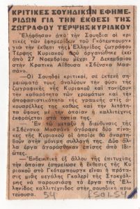 Σπύρος Παπαλουκάς Βάσω Κατράκη (1914 - 1988) ; Πάνος Βαλσαμάκης (1900 - 1986) ; Σπύρος Βασιλείου (1902 - 1985) ; Ορέστης Κανέλλης (1910 - 1979) ; Τάσσος Α. (1914 - 1985) ; Ελένη Βακαλό (1921 - 2001) ; Νικόλαος Χατζηκυριάκος-Γκίκας (1906 - 1994) ; Σπύρος Παπαλουκάς (1892 - 1957) ; Αγήνωρ Αστεριάδης (1898 - 1977) ; Τέρψη Κυριακού (1916 - 1993) ; Γιώργος Σικελιώτης (1917 - 1984) ; Γιάννης Μιγάδης (1926 - 2017) ; Σωσώ Χουτοπούλου-Κονταράτου (1923 - 1984) ; Γιάννης Γραμματικόπουλος (1928) ; Χρήστος Καπράλος (1909 - 1993) ; Μίνως Αργυράκης (1920 - 1998) ; Θόδωρος Μάρκελλος (1925 - 2015) ; Λίλη Αρλιώτη (1908 - 1979) ; Αλέκος Κοντόπουλος (1904 - 1975) ; Γιώργος Βακαλό (1902 - 1991) ; Σωκράτης Καραντινός (1906 - 1979) ; Νίκος-Γαβριήλ Πεντζίκης (1908 - 1993) ; Βέρα Χουτζούμη (1920 - 2007) ; Νικόλαος Βλαβιανός (1929) ; Χαρίκλεια Αλεξανδρίδου-Στεφανοπούλου (1889 - 1963) ; Ελένη Θεοχάρη-Περάκη ; Φώτης Ζαχαρίου (1909 - 2001) ; Εμμανουήλ Ζέπος- Αλαφούζος (1905 - 1995) ; Άγγελος Θεοδωρόπουλος (1883 - 1965) ; Μαρία Αναγνωστοπούλου-Βρανίκα (1890 - 1971) ; Δημήτριος Κεντάκας ; Άγγελος Κόντης (1912 - 2005) ; Γιώργος Μανουσάκης (1914 - 2003) ; Ιωάννα Ασμάνη (1929) ; Αγλαϊα Παπά (1904 - 1984) ; Γεώργιος Παραλής (1908 - 1975) ; Κώστας Πλακωτάρης (1902 - 1969) ; Σταμάτης Σταματόπουλος (1920 - ; ) ; Γιώργος Αναγνωστόπουλος (20ος αιώνας) ; Πέτρος Βαμπούλης (1929) ; Φώτης Φωτιάδης ; Μιχαήλ Κανάκης
