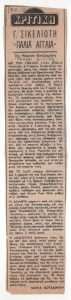 «Εκθέσεις ζωγραφικής. Μία ωραία πρωτοβουλία υπέρ των οικογενειών των Κυπρίων κρατουμένων» Τώνης Π. Σπητέρης (1910 - 1986) ; Βάσω Κατράκη (1914 - 1988) ; Σπύρος Βασιλείου (1902 - 1985) ; Ορέστης Κανέλλης (1910 - 1979) ; Τάσσος Α. (1914 - 1985) ; Νικόλαος Χατζηκυριάκος-Γκίκας (1906 - 1994) ; Γιάννης Μόραλης (1916 - 2009) ; Γεώργιος Γουναρόπουλος (1889 - 1977) ; Σπύρος Παπαλουκάς (1892 - 1957) ; Γιάννης Μηταράκης (1898 - 1963) ; Αγήνωρ Αστεριάδης (1898 - 1977) ; Γιώργος Σικελιώτης (1917 - 1984) ; Γιάννης Σπυρόπουλος (1912 - 1990) ; Γιάννης Τσαρούχης (1910 - 1989) ; Δημήτρης Γιαννουκάκης (1898 - 1991) ; Χρήστος Καπράλος (1909 - 1993) ; Λίλη Αρλιώτη (1908 - 1979) ; Φρόσω Ευθυμιάδη-Μενεγάκη ; Αλέκος Κοντόπουλος (1904 - 1975) ; Ευθύμιος Παπαδημητρίου (1895 - 1958) ; Γιώργος Μπουζιάνης (1885 - 1959) ; Γιάννης Κεφαλληνός (1894 - 1957) ; Περικλής Βυζάντιος (1893 - 1972) ; Δημήτρης Γιολδάσης (1897 - 1993) ; Κωνσταντίνος Γραμματόπουλος (1916 - 2003) ; Χρίστος Δαγκλής (1916 - 1991) ; Άγγελος Θεοδωρόπουλος (1883 - 1965) ; Γεώργιος Κοσμαδόπουλος (1895 - 1967) ; Κλέαρχος Λουκόπουλος (1906 - 1995) ; Αγλαϊα Παπά ; Φώτης Φωτιάδης