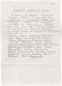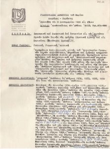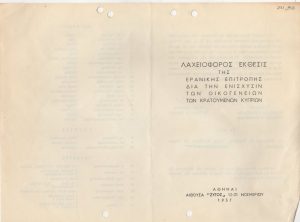 Έκθεση “Λαχειοφόρος έκθεσις της ερανικής επιτροπής δια την ενίσχυσιν των οικογενειών των κρατούμενων Κυπρίων” Τώνης Π. Σπητέρης (1910 - 1986) ; Βάσω Κατράκη (1914 - 1988) ; Σπύρος Βασιλείου (1902 - 1985) ; Ορέστης Κανέλλης (1910 - 1979) ; Τάσσος Α. (1914 - 1985) ; Νικόλαος Χατζηκυριάκος-Γκίκας (1906 - 1994) ; Γιάννης Μόραλης (1916 - 2009) ; Γεώργιος Γουναρόπουλος (1889 - 1977) ; Σπύρος Παπαλουκάς (1892 - 1957) ; Γιάννης Μηταράκης (1898 - 1963) ; Αγήνωρ Αστεριάδης (1898 - 1977) ; Γιώργος Σικελιώτης (1917 - 1984) ; Γιάννης Σπυρόπουλος (1912 - 1990) ; Γιάννης Τσαρούχης (1910 - 1989) ; Δημήτρης Γιαννουκάκης (1898 - 1991) ; Χρήστος Καπράλος (1909 - 1993) ; Λίλη Αρλιώτη (1908 - 1979) ; Φρόσω Ευθυμιάδη-Μενεγάκη ; Αλέκος Κοντόπουλος (1904 - 1975) ; Γιώργος Μπουζιάνης (1885 - 1959) ; Γιάννης Κεφαλληνός (1894 - 1957) ; Περικλής Βυζάντιος (1893 - 1972) ; Δημήτρης Γιολδάσης (1897 - 1993) ; Κωνσταντίνος Γραμματόπουλος (1916 - 2003) ; Χρίστος Δαγκλής (1916 - 1991) ; Άγγελος Θεοδωρόπουλος (1883 - 1965) ; Γεώργιος Κοσμαδόπουλος (1895 - 1967) ; Κλέαρχος Λουκόπουλος (1906 - 1995) ; Αγλαϊα Παπά