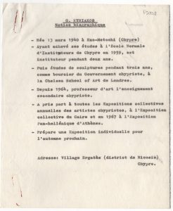 Διευθύνσεις κυπρίων καλλιτεχνών Αδαμάντιος Διαμαντής (1900 - 1994) ; Γιώργος Σκοτεινός (1937) ; Τηλέμαχος Κάνθος (1910 - 1993) ; Ανδρέας Λαδόμματος (1940) ; Γεώργιος Κυριάκου ; Δημήτρης Κωνσταντίνου (1924 - 2010) ; Στέλιος Βότσης (1922 - 2012) ; Κώστας Αβερκίου (1917 - 1981) ; Μαρία Δωρίτου ; Κώστας Ιωακείμ (1936) ; Γιουλίκα Λακερίδου (1940) ; Αντώνης Αντώνιος (1942) ; Νίκος Κουρούσης (1937) ; Άννα Κωνσταντίνου (1947) ; Μάριος Λοϊζίδης (1928 - 1988) ; Άγγελος Μακρίδης ; Ρέα Μπέιλυ-Αθανασιάδου ; Ανδρέας Σαββίδης ; Μάνος Κράλης ; Καίτη Στεφανίδου-Φασουλιώτου (1925 - 2012) ; Δημητράκης Γεροκώστας ; Χαρίλαος Δίκαιος ; Γιασουμής Γεωργίου ; Γεώργιος Θεμιστοκλέους ; Άντης Αδάμος ; Κώστας Αργυρού (1917 - 2001) ; Γεώργιος Κοτσώνης ; Στέλλα Μιχαηλίδου ; Αντρούλλα Αγγελίδου-Αντωνιάδου (1947) ; Αριστείδης Αναστασιάδης (1940) ; Λευτέρης Οικονόμου ; Βέρα Χατζηδά-Γαβριηλίδου ; Κωνσταντίνος Γιαννικούρης ; Σούλα Λειψού-Γιάγκου ; Εύρος Ευρυβιάδης ; Ανδρέας Εφεσόπουλος ; Βίκτωρ Ιωαννίδης ; Μαρία Κάνθου-Δανιήλ ; Βαθούλα Κούμα ; Νίκη Μαραγκού ; Αλέκα Ματέλλα ; Έλλη Μιτζή ; Μίκης Α. Μιχαηλίδης ; Στασίνος Παράσχος ; Άντης Παρτζίλης ; Ανδρέας Ποαρός ; Άννα Ρώσση-Νικολαΐδου ; Ανδρέας Σολέας