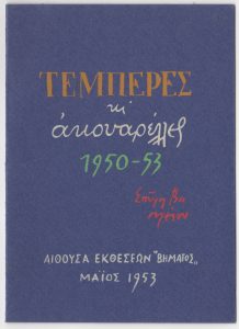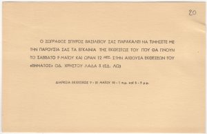 Έκθεση “Λαχειοφόρος έκθεσις της ερανικής επιτροπής δια την ενίσχυσιν των οικογενειών των κρατούμενων Κυπρίων” Τώνης Π. Σπητέρης (1910 - 1986) ; Βάσω Κατράκη (1914 - 1988) ; Σπύρος Βασιλείου (1902 - 1985) ; Ορέστης Κανέλλης (1910 - 1979) ; Τάσσος Α. (1914 - 1985) ; Νικόλαος Χατζηκυριάκος-Γκίκας (1906 - 1994) ; Γιάννης Μόραλης (1916 - 2009) ; Γεώργιος Γουναρόπουλος (1889 - 1977) ; Σπύρος Παπαλουκάς (1892 - 1957) ; Γιάννης Μηταράκης (1898 - 1963) ; Αγήνωρ Αστεριάδης (1898 - 1977) ; Γιώργος Σικελιώτης (1917 - 1984) ; Γιάννης Σπυρόπουλος (1912 - 1990) ; Γιάννης Τσαρούχης (1910 - 1989) ; Δημήτρης Γιαννουκάκης (1898 - 1991) ; Χρήστος Καπράλος (1909 - 1993) ; Λίλη Αρλιώτη (1908 - 1979) ; Φρόσω Ευθυμιάδη-Μενεγάκη ; Αλέκος Κοντόπουλος (1904 - 1975) ; Γιώργος Μπουζιάνης (1885 - 1959) ; Γιάννης Κεφαλληνός (1894 - 1957) ; Περικλής Βυζάντιος (1893 - 1972) ; Δημήτρης Γιολδάσης (1897 - 1993) ; Κωνσταντίνος Γραμματόπουλος (1916 - 2003) ; Χρίστος Δαγκλής (1916 - 1991) ; Άγγελος Θεοδωρόπουλος (1883 - 1965) ; Γεώργιος Κοσμαδόπουλος (1895 - 1967) ; Κλέαρχος Λουκόπουλος (1906 - 1995) ; Αγλαϊα Παπά (1904 - 1984)