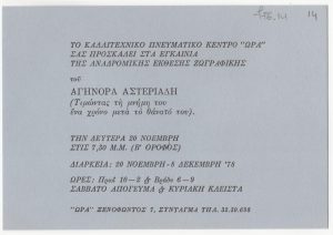 Έκθεση “Λαχειοφόρος έκθεσις της ερανικής επιτροπής δια την ενίσχυσιν των οικογενειών των κρατούμενων Κυπρίων” Τώνης Π. Σπητέρης (1910 - 1986) ; Βάσω Κατράκη (1914 - 1988) ; Σπύρος Βασιλείου (1902 - 1985) ; Ορέστης Κανέλλης (1910 - 1979) ; Τάσσος Α. (1914 - 1985) ; Νικόλαος Χατζηκυριάκος-Γκίκας (1906 - 1994) ; Γιάννης Μόραλης (1916 - 2009) ; Γεώργιος Γουναρόπουλος (1889 - 1977) ; Σπύρος Παπαλουκάς (1892 - 1957) ; Γιάννης Μηταράκης (1898 - 1963) ; Αγήνωρ Αστεριάδης (1898 - 1977) ; Γιώργος Σικελιώτης (1917 - 1984) ; Γιάννης Σπυρόπουλος (1912 - 1990) ; Γιάννης Τσαρούχης (1910 - 1989) ; Δημήτρης Γιαννουκάκης (1898 - 1991) ; Χρήστος Καπράλος (1909 - 1993) ; Λίλη Αρλιώτη (1908 - 1979) ; Φρόσω Ευθυμιάδη-Μενεγάκη ; Αλέκος Κοντόπουλος (1904 - 1975) ; Γιώργος Μπουζιάνης (1885 - 1959) ; Γιάννης Κεφαλληνός (1894 - 1957) ; Περικλής Βυζάντιος (1893 - 1972) ; Δημήτρης Γιολδάσης (1897 - 1993) ; Κωνσταντίνος Γραμματόπουλος (1916 - 2003) ; Χρίστος Δαγκλής (1916 - 1991) ; Άγγελος Θεοδωρόπουλος (1883 - 1965) ; Γεώργιος Κοσμαδόπουλος (1895 - 1967) ; Κλέαρχος Λουκόπουλος (1906 - 1995) ; Αγλαϊα Παπά (1904 - 1984)