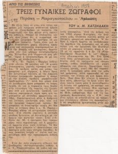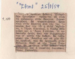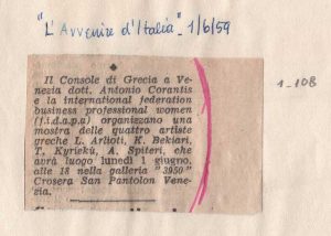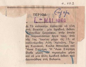 «Εκθέσεις ζωγραφικής. Μία ωραία πρωτοβουλία υπέρ των οικογενειών των Κυπρίων κρατουμένων» Τώνης Π. Σπητέρης (1910 - 1986) ; Βάσω Κατράκη (1914 - 1988) ; Σπύρος Βασιλείου (1902 - 1985) ; Ορέστης Κανέλλης (1910 - 1979) ; Τάσσος Α. (1914 - 1985) ; Νικόλαος Χατζηκυριάκος-Γκίκας (1906 - 1994) ; Γιάννης Μόραλης (1916 - 2009) ; Γεώργιος Γουναρόπουλος (1889 - 1977) ; Σπύρος Παπαλουκάς (1892 - 1957) ; Γιάννης Μηταράκης (1898 - 1963) ; Αγήνωρ Αστεριάδης (1898 - 1977) ; Γιώργος Σικελιώτης (1917 - 1984) ; Γιάννης Σπυρόπουλος (1912 - 1990) ; Γιάννης Τσαρούχης (1910 - 1989) ; Δημήτρης Γιαννουκάκης (1898 - 1991) ; Χρήστος Καπράλος (1909 - 1993) ; Λίλη Αρλιώτη (1908 - 1979) ; Φρόσω Ευθυμιάδη-Μενεγάκη ; Αλέκος Κοντόπουλος (1904 - 1975) ; Ευθύμιος Παπαδημητρίου (1895 - 1958) ; Γιώργος Μπουζιάνης (1885 - 1959) ; Γιάννης Κεφαλληνός (1894 - 1957) ; Περικλής Βυζάντιος (1893 - 1972) ; Δημήτρης Γιολδάσης (1897 - 1993) ; Κωνσταντίνος Γραμματόπουλος (1916 - 2003) ; Χρίστος Δαγκλής (1916 - 1991) ; Άγγελος Θεοδωρόπουλος (1883 - 1965) ; Γεώργιος Κοσμαδόπουλος (1895 - 1967) ; Κλέαρχος Λουκόπουλος (1906 - 1995) ; Αγλαϊα Παπά (1904 - 1984) ; Φώτης Φωτιάδης