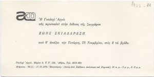 Έκθεση “Προσφορά για την Κύπρο” Κούλα Μπεκιάρη (1905 - 1992) ; Πιπίτσα Φιλιππίδη (1923 - 1995) ; Κατερίνα Χαλεπά-Κατσάτου (1925 - 2004) ; Μαρία Χατζηγάκη ; Άρια Κομιανού (1938 - 2015) ; Τίτσα Χρυσοχοϊδη (1906 - 1990) ; Νίνα Εμμανουήλ ; Ελένη Ζέρβα ; Ρόζα Ηλιού ; Τζούλια Ανδρειάδου (1937) ; Στέλλα Ανδρουλιδάκη-Ντούτσια (1939) ; Θάλεια Κλεώπα (1928) ; Ιφιγένεια Λαγάνα ; Ιωάννα Μαλάμου-Μητσέα (1913 - 2004) ; Έφη Π. Μιχελή (1906 - 1984) ; Κλειώ Νάτση (1929 - 2024) ; Μαρία Ρουσέα ; Ζωή Σκιαδαρέση (1934 - 2014) ; Αλεξάνδρα Πετρίτζη-Μαυροκορδάτου ; Νίκη Τυπάλδου ; Νενέττα Κοσμετάτου ; Αλίκη Βενιέρη-Σκουλικίδη (1934) ; Τζένη Μαρκάκη (1939) ; Ελένη Λαναρά ; Άννα Κοντογεώργη ; Νότα Σιοτρόπου-Γεωργίου (1932 - 2014) ; Εμμανουηλίδη-Λεδάκη ; Ελένη Οικονομίδου (1940) ; Ίρις Ξυλά-Ξαναλάτου (1941) ; Πίτσα Μαύρου-Μπρέμπου ; Μαρουσώ Κοτσολάκη ; Σωσώ Κυπαρίσση-Λιώρη ; Κωστοπούλου-Εμπειρίκου ; Λέλα ; Αλεξάνδρα Μαυρογορδάτου-Πετρίτζη ; Βασιλική Μπινιώρη ; Σιώκου ; Χαρμπούρη (20ος αιώνας)