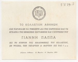 Κατάλογος Ελλήνων καλλιτεχνών Κώστας Ανδρέου (1917 - 2007) ; Τώνης Π. Σπητέρης (1910 - 1986) ; Ιωάννα Σπητέρη-Βεροπούλου (1920 - 2000) ; Μιχάλης Τόμπρος (1889 - 1974) ; Δημήτρης Χατζής ; Μπέλλα Ραφτοπούλου (1902 - 1992) ; Γαβριέλλα Σίμωσι (1926 - 1999) ; Σωσώ Χουτοπούλου-Κονταράτου (1923 - 1984) ; Χρήστος Καπράλος (1909 - 1993) ; Γεράσιμος Σκλάβος (1927 - 1967) ; Αντώνης Καραχάλιος ; Γιώργος Ζογγολόπουλος (1903 - 2004) ; Θανάσης Απάρτης (1899 - 1972) ; Φρόσω Ευθυμιάδη-Μενεγάκη ; Αχιλλέας Απέργης (1909 - 1986) ; Αντώνης Σώχος (1888 - 1975) ; Άλεξ Μυλωνά (1923 - 2016) ; Κώστας Κουλεντιανός (1918 - 1995) ; Κώστας Βαλσάμης (1908 - 2003) ; Ιωάννης Αβραμίδης (1922 - 2016) ; Θόδωρος (1931 - 2018) ; Τάκις (1925 - 2019) ; Χρύσα (Βαρδέα) (1933 - 2013) ; Λάζαρος Λαμέρας (1913 - 1998) ; Φιλόλαος (1923 - 2010) ; Γεώργιος Γεωργίου (1916 - ; ) ; Γιάννης Παππάς ; Νικόλαος Ίκαρης (1920 - 1994) ; Δημήτρης Καλαμάρας ; Κώστας Κλουβάτος (1923 - 2007) ; Λουκάς Σαμαράς (1936) ; Λεκάκης Μιχάλης ; Κλέαρχος Λουκόπουλος (1906 - 1995) ; Αγλαΐα Λυμπεράκη (1923 - 1985) ; Δημήτρης Αρμακόλας (1939 - 2009) ; Γιώργος Νικολαΐδης (1924 - 2001) ; Κοσμάς Ξενάκης (1925 - 1984) ; Ναυσικά Πάστρα (1921 - 2011) ; Πολύγνωτος Βαγής (1894 - 1965) ; Νικόλαος Περαντινός (1910 - 1991) ; Αντώνης Μαυρίκιος