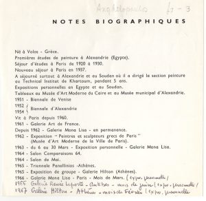 Κατάλογος των συμμετεχόντων στην έκθεση “Artistes grecs à Paris” Ιωάννα Σπητέρη-Βεροπούλου (1920 - 2000) ; Μάρκος Βαφειάδης (1906 - 1992) ; Μπέλλα Ραφτοπούλου (1902 - 1992) ; Παύλος (Διονυσόπουλος) (1930 - 2019) ; Τζον Χριστοφόρου (1921 - 2014) ; Αλέκος Φασιανός (1935 - 2022) ; Μανώλης Καλλιγιάννης ; Γαβριέλλα Σίμωσι (1926 - 1999) ; Γιάννης Τσαρούχης (1910 - 1989) ; Κώστας Τσόκλης (1930) ; Δανιήλ (1924 - 2008) ; Κώστας Κουλεντιανός (1918 - 1995) ; Ντίκος Βυζάντιος (1924 - 2007) ; Ρένα Τζολάκη (1930) ; Αριστομένης Αγγελόπουλος (1900 - 1990) ; Φιλόλαος (1923 - 2010) ; Γιάννης Φωκάς (1951) ; Κώστας Χαραλαμπίδης (1946) ; Άλκης Πιερράκος (1920 - 2017) ; Βασίλης Σπεράντζας (1938) ; Σαράντης Καραβούζης (1938 - 2011) ; Γιουλίκα Λακερίδου (1940) ; Άννα Κινδύνη-Μαρουδή ; Τίτα Κριεζή (1930 - 2021) ; Αγλαΐα Λυμπεράκη (1923 - 1985) ; Κώστας Μακρής ; Γιάννης Μαλτέζος (1915 - 1987) ; Ιάσων Μολφέσης (1925 - 2009) ; Κωνσταντίνος Μόραλης ; Γιάννης Μπουτέας (1941) ; Κωνσταντίνος Ξενάκης (1931 - 2020) ; Ναυσικά Πάστρα (1921 - 2011) ; Gisele Πράσινου ; Βασιλική Τσεκούρα ; Πάνος Ελευθερίου ; Δημήτρης Ράτσικας ; Νίκος Δαμιανάκης (1920 - 2013) ; Μίλτος Παντελιάς (1954) ; Νίκος Τσιώτης ; Εριέττα Βορδώνη (1959) ; Κωνσταντίνος Γιαννικούρης
