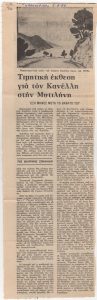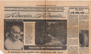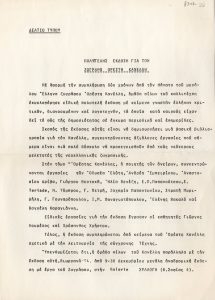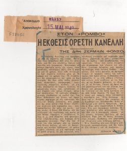 «Εκθέσεις ζωγραφικής. Μία ωραία πρωτοβουλία υπέρ των οικογενειών των Κυπρίων κρατουμένων» Τώνης Π. Σπητέρης (1910 - 1986) ; Βάσω Κατράκη (1914 - 1988) ; Σπύρος Βασιλείου (1902 - 1985) ; Ορέστης Κανέλλης (1910 - 1979) ; Τάσσος Α. (1914 - 1985) ; Νικόλαος Χατζηκυριάκος-Γκίκας (1906 - 1994) ; Γιάννης Μόραλης (1916 - 2009) ; Γεώργιος Γουναρόπουλος (1889 - 1977) ; Σπύρος Παπαλουκάς (1892 - 1957) ; Γιάννης Μηταράκης (1898 - 1963) ; Αγήνωρ Αστεριάδης (1898 - 1977) ; Γιώργος Σικελιώτης (1917 - 1984) ; Γιάννης Σπυρόπουλος (1912 - 1990) ; Γιάννης Τσαρούχης (1910 - 1989) ; Δημήτρης Γιαννουκάκης (1898 - 1991) ; Χρήστος Καπράλος (1909 - 1993) ; Λίλη Αρλιώτη (1908 - 1979) ; Φρόσω Ευθυμιάδη-Μενεγάκη ; Αλέκος Κοντόπουλος (1904 - 1975) ; Ευθύμιος Παπαδημητρίου (1895 - 1958) ; Γιώργος Μπουζιάνης (1885 - 1959) ; Γιάννης Κεφαλληνός (1894 - 1957) ; Περικλής Βυζάντιος (1893 - 1972) ; Δημήτρης Γιολδάσης (1897 - 1993) ; Κωνσταντίνος Γραμματόπουλος (1916 - 2003) ; Χρίστος Δαγκλής (1916 - 1991) ; Άγγελος Θεοδωρόπουλος (1883 - 1965) ; Γεώργιος Κοσμαδόπουλος (1895 - 1967) ; Κλέαρχος Λουκόπουλος (1906 - 1995) ; Αγλαϊα Παπά (1904 - 1984) ; Φώτης Φωτιάδης