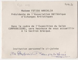Ομαδική έκθεση «Ελληνικός Μήνας στη Βιέννη». Πάνος Βαλσαμάκης (1900 - 1986) ; Δημήτρης Γιαννουκάκης (1898 - 1991) ; Θόδωρος Μάρκελλος (1925 - 2015) ; Γιάννης Γαΐτης (1923 - 1984) ; Κούλα Μπεκιάρη (1905 - 1992) ; Δημήτρης Μυταράς (1934 - 2017) ; Πιπίτσα Φιλιππίδη (1923 - 1995) ; Χαρίκλεια Φωτίου-Χατζησάββα (1918 - 1984) ; Κωνσταντίνος Γιαννακόπουλος (1927 - 2000) ; Αντώνης Απέργης (1938 - 2018) ; Τάκης Παρλαβάντζας ; Πέτρος Ζουμπουλάκης (1937) ; Θάλεια Κλεώπα (1928) ; Γεώργιος Λολοσίδης (1937 - 2015) ; Μποστ (1918 - 1995) ; Μαρία Σπέντζα (1925 - 2011) ; Μανόλης Πηλαδάκης (1927) ; Μερόπη Πρέκα-Στεφανάτου (1934 - 2025) ; Πάρις Πρέκας (1926 - 1999) ; Λιλή Αντωνιάδη-Στεφανάκη (1938) ; Ιωάννης Σεργουλόπουλος ; Βασίλειος Σπηλιωτόπουλος ; Σταμάτης-Παναγιώτης Μεταξάς (1936) ; Στέφανος Δασκαλάκης (1952) ; Ιωάννης Παπανελόπουλος (1936) ; Άγγελος Κουγιουμτζής (1920 - 2011) ; Σπύρος Κουρσάρης ; Κωνσταντίνος Παπασταμούλης ; Γιάννης Πούλιος