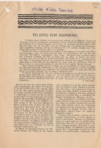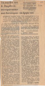 «Εκθέσεις ζωγραφικής. Μία ωραία πρωτοβουλία υπέρ των οικογενειών των Κυπρίων κρατουμένων» Τώνης Π. Σπητέρης (1910 - 1986) ; Βάσω Κατράκη (1914 - 1988) ; Σπύρος Βασιλείου (1902 - 1985) ; Ορέστης Κανέλλης (1910 - 1979) ; Τάσσος Α. (1914 - 1985) ; Νικόλαος Χατζηκυριάκος-Γκίκας (1906 - 1994) ; Γιάννης Μόραλης (1916 - 2009) ; Γεώργιος Γουναρόπουλος (1889 - 1977) ; Σπύρος Παπαλουκάς (1892 - 1957) ; Γιάννης Μηταράκης (1898 - 1963) ; Αγήνωρ Αστεριάδης (1898 - 1977) ; Γιώργος Σικελιώτης (1917 - 1984) ; Γιάννης Σπυρόπουλος (1912 - 1990) ; Γιάννης Τσαρούχης (1910 - 1989) ; Δημήτρης Γιαννουκάκης (1898 - 1991) ; Χρήστος Καπράλος (1909 - 1993) ; Λίλη Αρλιώτη (1908 - 1979) ; Φρόσω Ευθυμιάδη-Μενεγάκη ; Αλέκος Κοντόπουλος (1904 - 1975) ; Ευθύμιος Παπαδημητρίου (1895 - 1958) ; Γιώργος Μπουζιάνης (1885 - 1959) ; Γιάννης Κεφαλληνός (1894 - 1957) ; Περικλής Βυζάντιος (1893 - 1972) ; Δημήτρης Γιολδάσης (1897 - 1993) ; Κωνσταντίνος Γραμματόπουλος (1916 - 2003) ; Χρίστος Δαγκλής (1916 - 1991) ; Άγγελος Θεοδωρόπουλος (1883 - 1965) ; Γεώργιος Κοσμαδόπουλος (1895 - 1967) ; Κλέαρχος Λουκόπουλος (1906 - 1995) ; Αγλαϊα Παπά (1904 - 1984) ; Φώτης Φωτιάδης