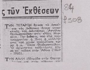 Έκθεση “Λαχειοφόρος έκθεσις της ερανικής επιτροπής δια την ενίσχυσιν των οικογενειών των κρατούμενων Κυπρίων” Τώνης Π. Σπητέρης (1910 - 1986) ; Βάσω Κατράκη (1914 - 1988) ; Σπύρος Βασιλείου (1902 - 1985) ; Ορέστης Κανέλλης (1910 - 1979) ; Τάσσος Α. (1914 - 1985) ; Νικόλαος Χατζηκυριάκος-Γκίκας (1906 - 1994) ; Γιάννης Μόραλης (1916 - 2009) ; Γεώργιος Γουναρόπουλος (1889 - 1977) ; Σπύρος Παπαλουκάς (1892 - 1957) ; Γιάννης Μηταράκης (1898 - 1963) ; Αγήνωρ Αστεριάδης (1898 - 1977) ; Γιώργος Σικελιώτης (1917 - 1984) ; Γιάννης Σπυρόπουλος (1912 - 1990) ; Γιάννης Τσαρούχης (1910 - 1989) ; Δημήτρης Γιαννουκάκης (1898 - 1991) ; Χρήστος Καπράλος (1909 - 1993) ; Λίλη Αρλιώτη (1908 - 1979) ; Φρόσω Ευθυμιάδη-Μενεγάκη ; Αλέκος Κοντόπουλος (1904 - 1975) ; Γιώργος Μπουζιάνης (1885 - 1959) ; Γιάννης Κεφαλληνός (1894 - 1957) ; Περικλής Βυζάντιος (1893 - 1972) ; Δημήτρης Γιολδάσης (1897 - 1993) ; Κωνσταντίνος Γραμματόπουλος (1916 - 2003) ; Χρίστος Δαγκλής (1916 - 1991) ; Άγγελος Θεοδωρόπουλος (1883 - 1965) ; Γεώργιος Κοσμαδόπουλος (1895 - 1967) ; Κλέαρχος Λουκόπουλος (1906 - 1995) ; Αγλαϊα Παπά (1904 - 1984)