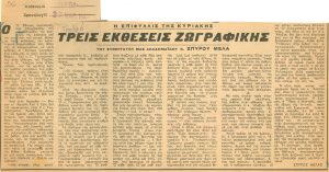 «Εκθέσεις ζωγραφικής. Μία ωραία πρωτοβουλία υπέρ των οικογενειών των Κυπρίων κρατουμένων» Τώνης Π. Σπητέρης (1910 - 1986) ; Βάσω Κατράκη (1914 - 1988) ; Σπύρος Βασιλείου (1902 - 1985) ; Ορέστης Κανέλλης (1910 - 1979) ; Τάσσος Α. (1914 - 1985) ; Νικόλαος Χατζηκυριάκος-Γκίκας (1906 - 1994) ; Γιάννης Μόραλης (1916 - 2009) ; Γεώργιος Γουναρόπουλος (1889 - 1977) ; Σπύρος Παπαλουκάς (1892 - 1957) ; Γιάννης Μηταράκης (1898 - 1963) ; Αγήνωρ Αστεριάδης (1898 - 1977) ; Γιώργος Σικελιώτης (1917 - 1984) ; Γιάννης Σπυρόπουλος (1912 - 1990) ; Γιάννης Τσαρούχης (1910 - 1989) ; Δημήτρης Γιαννουκάκης (1898 - 1991) ; Χρήστος Καπράλος (1909 - 1993) ; Λίλη Αρλιώτη (1908 - 1979) ; Φρόσω Ευθυμιάδη-Μενεγάκη ; Αλέκος Κοντόπουλος (1904 - 1975) ; Ευθύμιος Παπαδημητρίου (1895 - 1958) ; Γιώργος Μπουζιάνης (1885 - 1959) ; Γιάννης Κεφαλληνός (1894 - 1957) ; Περικλής Βυζάντιος (1893 - 1972) ; Δημήτρης Γιολδάσης (1897 - 1993) ; Κωνσταντίνος Γραμματόπουλος (1916 - 2003) ; Χρίστος Δαγκλής (1916 - 1991) ; Άγγελος Θεοδωρόπουλος (1883 - 1965) ; Γεώργιος Κοσμαδόπουλος (1895 - 1967) ; Κλέαρχος Λουκόπουλος (1906 - 1995) ; Αγλαϊα Παπά (1904 - 1984) ; Φώτης Φωτιάδης