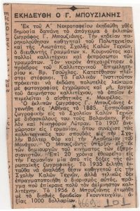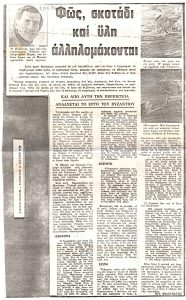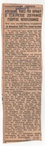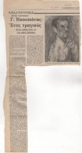 «Εκθέσεις ζωγραφικής. Μία ωραία πρωτοβουλία υπέρ των οικογενειών των Κυπρίων κρατουμένων» Τώνης Π. Σπητέρης (1910 - 1986) ; Βάσω Κατράκη (1914 - 1988) ; Σπύρος Βασιλείου (1902 - 1985) ; Ορέστης Κανέλλης (1910 - 1979) ; Τάσσος Α. (1914 - 1985) ; Νικόλαος Χατζηκυριάκος-Γκίκας (1906 - 1994) ; Γιάννης Μόραλης (1916 - 2009) ; Γεώργιος Γουναρόπουλος (1889 - 1977) ; Σπύρος Παπαλουκάς (1892 - 1957) ; Γιάννης Μηταράκης (1898 - 1963) ; Αγήνωρ Αστεριάδης (1898 - 1977) ; Γιώργος Σικελιώτης (1917 - 1984) ; Γιάννης Σπυρόπουλος (1912 - 1990) ; Γιάννης Τσαρούχης (1910 - 1989) ; Δημήτρης Γιαννουκάκης (1898 - 1991) ; Χρήστος Καπράλος (1909 - 1993) ; Λίλη Αρλιώτη (1908 - 1979) ; Φρόσω Ευθυμιάδη-Μενεγάκη ; Αλέκος Κοντόπουλος (1904 - 1975) ; Ευθύμιος Παπαδημητρίου (1895 - 1958) ; Γιώργος Μπουζιάνης (1885 - 1959) ; Γιάννης Κεφαλληνός (1894 - 1957) ; Περικλής Βυζάντιος (1893 - 1972) ; Δημήτρης Γιολδάσης (1897 - 1993) ; Κωνσταντίνος Γραμματόπουλος (1916 - 2003) ; Χρίστος Δαγκλής (1916 - 1991) ; Άγγελος Θεοδωρόπουλος (1883 - 1965) ; Γεώργιος Κοσμαδόπουλος (1895 - 1967) ; Κλέαρχος Λουκόπουλος (1906 - 1995) ; Αγλαϊα Παπά (1904 - 1984) ; Φώτης Φωτιάδης