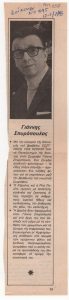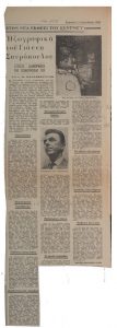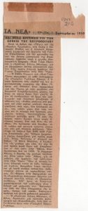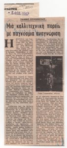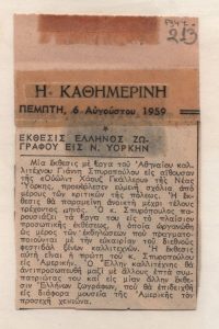 «Εκθέσεις ζωγραφικής. Μία ωραία πρωτοβουλία υπέρ των οικογενειών των Κυπρίων κρατουμένων» Τώνης Π. Σπητέρης (1910 - 1986) ; Βάσω Κατράκη (1914 - 1988) ; Σπύρος Βασιλείου (1902 - 1985) ; Ορέστης Κανέλλης (1910 - 1979) ; Τάσσος Α. (1914 - 1985) ; Νικόλαος Χατζηκυριάκος-Γκίκας (1906 - 1994) ; Γιάννης Μόραλης (1916 - 2009) ; Γεώργιος Γουναρόπουλος (1889 - 1977) ; Σπύρος Παπαλουκάς (1892 - 1957) ; Γιάννης Μηταράκης (1898 - 1963) ; Αγήνωρ Αστεριάδης (1898 - 1977) ; Γιώργος Σικελιώτης (1917 - 1984) ; Γιάννης Σπυρόπουλος (1912 - 1990) ; Γιάννης Τσαρούχης (1910 - 1989) ; Δημήτρης Γιαννουκάκης (1898 - 1991) ; Χρήστος Καπράλος (1909 - 1993) ; Λίλη Αρλιώτη (1908 - 1979) ; Φρόσω Ευθυμιάδη-Μενεγάκη ; Αλέκος Κοντόπουλος (1904 - 1975) ; Ευθύμιος Παπαδημητρίου (1895 - 1958) ; Γιώργος Μπουζιάνης (1885 - 1959) ; Γιάννης Κεφαλληνός (1894 - 1957) ; Περικλής Βυζάντιος (1893 - 1972) ; Δημήτρης Γιολδάσης (1897 - 1993) ; Κωνσταντίνος Γραμματόπουλος (1916 - 2003) ; Χρίστος Δαγκλής (1916 - 1991) ; Άγγελος Θεοδωρόπουλος (1883 - 1965) ; Γεώργιος Κοσμαδόπουλος (1895 - 1967) ; Κλέαρχος Λουκόπουλος (1906 - 1995) ; Αγλαϊα Παπά (1904 - 1984) ; Φώτης Φωτιάδης