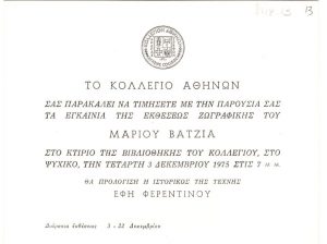 Έκθεση “Πανόραμα Ελληνικής Ζωγραφικής 1950-1975” Γιώργος Ιωάννου (1926 - 2017) ; Γιώργος Τούγιας (1922 - 1994) ; Σωτήρης Σόρογκας (1936) ; Λουκάς Βενετούλιας (1930 - 1984) ; Νίκος Σαχίνης (1924 - 1989) ; Μανώλης Καλλιγιάννης ; Γιάννης Μιγάδης (1926 - 2017) ; Γιώργος Σκοτεινός (1937) ; Φώτης Σαρρής ; Γιώργος Βακιρτζής (1923 - 1988) ; Θόδωρος Μάρκελλος (1925 - 2015) ; Γιάννης Γαΐτης (1923 - 1984) ; Δημήτρης Μυταράς (1934 - 2017) ; Παντελής Ξαγοράρης (1929 - 2000) ; Χρίστος Καράς (1930 - 2023) ; Γιώργος Τουζένης (1957) ; Μάριος Βατζιάς (1926 - 2008) ; Γιώργος Βογιατζής (1935 - 1993) ; Βασίλης Κυπραίος (1936 - 2021) ; Στέλιος Βότσης (1922 - 2012) ; Μιχάλης Γεωργάς (1947) ; Νικόλαος Γεωργιάδης (1925 - 2001) ; Παναγιώτης Τέτσης (1925 - 2016) ; Νέλλα Γκόλαντα (1941 - 2023) ; Δανιήλ Γουναρίδης (1934) ; Αχιλλέας Δρούγκας (1940) ; Πέτρος Ζουμπουλάκης (1937) ; Νίκη Καναγκίνη (1933 - 2008) ; Κώστας Ηλιάκης ; Μάκης Θεοφυλακτόπουλος (1939 - 2023) ; Λευτέρης Κανακάκις (1934 - 1985) ; Βλάσης Κανιάρης (1928 - 2011) ; Σαράντης Καραβούζης (1938 - 2011) ; Τάκης Κατσουλίδης (1933) ; Βασίλης Κελαϊδής (1938) ; Θάλεια Κλεώπα (1928) ; Δημήτρης Κοντός (1931 - 1996) ; Νίκος Κουρούσης (1937) ; Στάθης Λογοθέτης (1925 - 1997) ; Θεόδωρος Μανωλίδης (1940) ; Στέλιος Μαυρομάτης (1930 - 2020) ; Γιάννης Μιχαηλίδης (1940) ; Γιάννης Μίχας (1938 - 2008) ; Παύλος Μοσχίδης (1927 - 2004) ; Χρόνης Μπότσογλου (1941 - 2022) ; Μαρία Σπέντζα (1925 - 2011) ; Κλειώ Νάτση (1929 - 2024) ; Μπία Ντάβου (1932 - 1996) ; Θωμάς Παπαδοπεράκης (1943) ; Μανόλης Πηλαδάκης (1927) ; Πάρις Πρέκας (1926 - 1999) ; Λευτέρης Ρόρρος (1939 - 1967) ; Δημήτρης Σακελλίων (1947) ; Τάκης Σιδέρης (1929) ; Ζωή Σκιαδαρέση (1934 - 2014) ; Θανάσης Στεφόπουλος (1928 - 2012)
