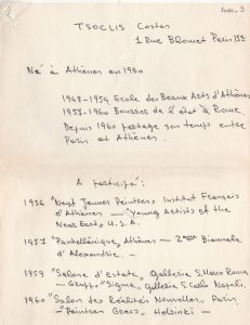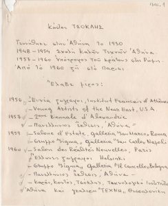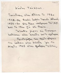 Βιογραφικά σημειώματα καλλιτεχνών Νίκος Εγγονόπουλος (1907 - 1985) ; Κώστας Ανδρέου (1917 - 2007) ; Τώνης Π. Σπητέρης (1910 - 1986) ; Βάσω Κατράκη (1914 - 1988) ; Ιωάννα Σπητέρη-Βεροπούλου (1920 - 2000) ; Μιχάλης Τόμπρος (1889 - 1974) ; Τάσσος Α. (1914 - 1985) ; Νικόλαος Χατζηκυριάκος-Γκίκας (1906 - 1994) ; Γιάννης Μόραλης (1916 - 2009) ; Γεώργιος Γουναρόπουλος (1889 - 1977) ; Σπύρος Παπαλουκάς (1892 - 1957) ; Παύλος (Διονυσόπουλος) (1930 - 2019) ; Γιάννης Μηταράκης (1898 - 1963) ; Τζον Χριστοφόρου (1921 - 2014) ; Δημήτρης Περδικίδης (1922 - 1989) ; Νίκος Σαχίνης (1924 - 1989) ; Θάνος Τσίγκος (1914 - 1965) ; Γαβριέλλα Σίμωσι (1926 - 1999) ; Γιάννης Σπυρόπουλος (1912 - 1990) ; Γιάννης Τσαρούχης (1910 - 1989) ; Κώστας Τσόκλης (1930) ; Γιώργος Σκοτεινός (1937) ; Γιώργος Ζογγολόπουλος (1903 - 2004) ; Λίλη Αρλιώτη (1908 - 1979) ; Φρόσω Ευθυμιάδη-Μενεγάκη ; Δανιήλ (1924 - 2008) ; Αχιλλέας Απέργης (1909 - 1986) ; Αλέκος Κοντόπουλος (1904 - 1975) ; Κώστας Κουλεντιανός (1918 - 1995) ; Γιώργος Μπουζιάνης (1885 - 1959) ; Γιάννης Γαΐτης (1923 - 1984) ; Ιωάννης Αβραμίδης (1922 - 2016) ; Κούλα Μπεκιάρη (1905 - 1992) ; Χρίστος Καράς (1930 - 2023) ; Τάκις (1925 - 2019) ; Φιλόλαος (1923 - 2010) ; Άλκης Πιερράκος (1920 - 2017) ; Γιάννης Κουνέλλης ; Βλάσης Κανιάρης (1928 - 2011) ; Κώστας Καραχάλιος (1923 - 2007) ; Κλέαρχος Λουκόπουλος (1906 - 1995) ; Αγλαΐα Λυμπεράκη (1923 - 1985) ; Γιώργος Μαυροΐδης (1912 - 2003) ; Μιχαήλ Μιχαηλίδης (1923 - 2015) ; Ιάσων Μολφέσης (1925 - 2009)